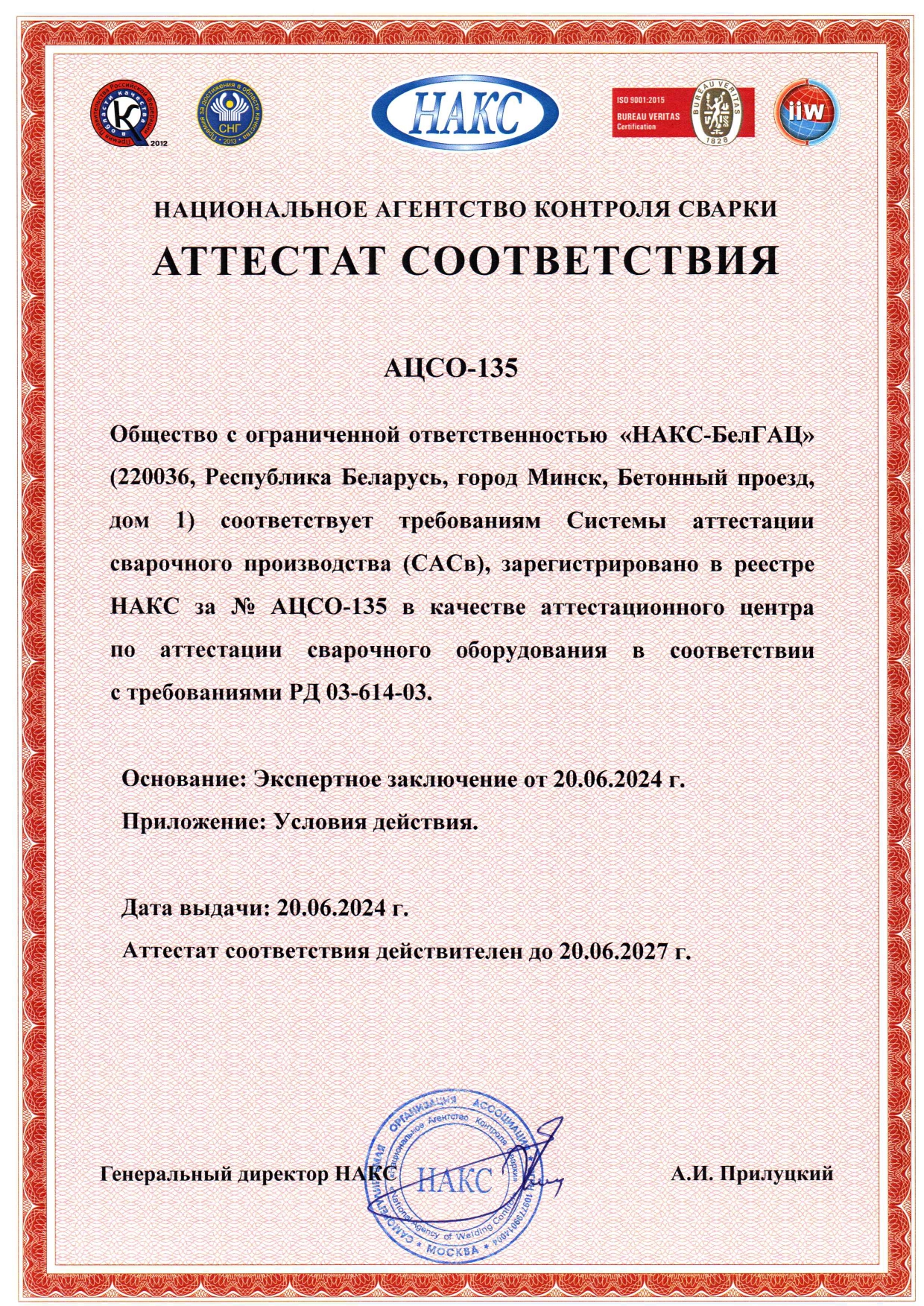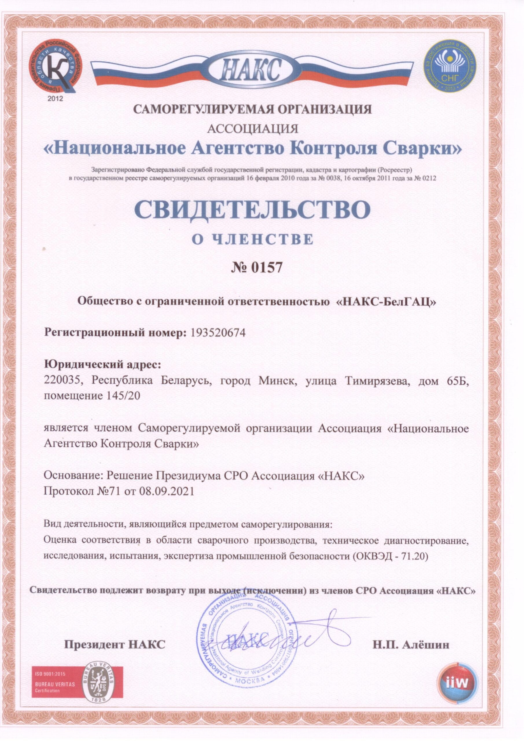 Общество с ограниченной ответственностью «НАКС-БелГАЦ» является членом Саморегулируемой организации Ассоциация «Национальное Агентство Контроля Сварки» (НАКС, www.naks.ru).