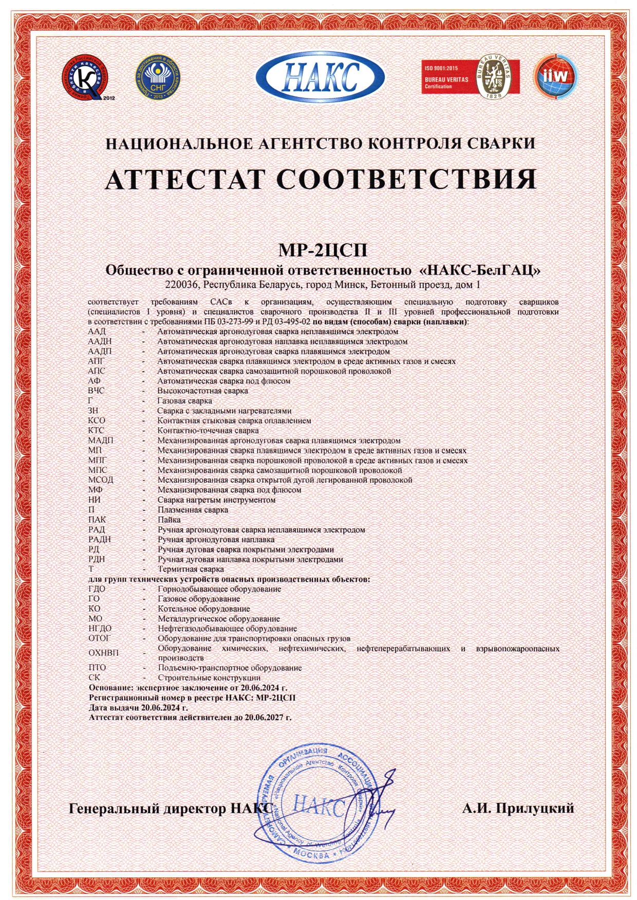 ООО «НАКС – БелГАЦ» в Реестре НАКС: аттестация персонала МР-31АЦ, аттестация технологий АЦСТ-154, аттестация оборудования АЦСО-135